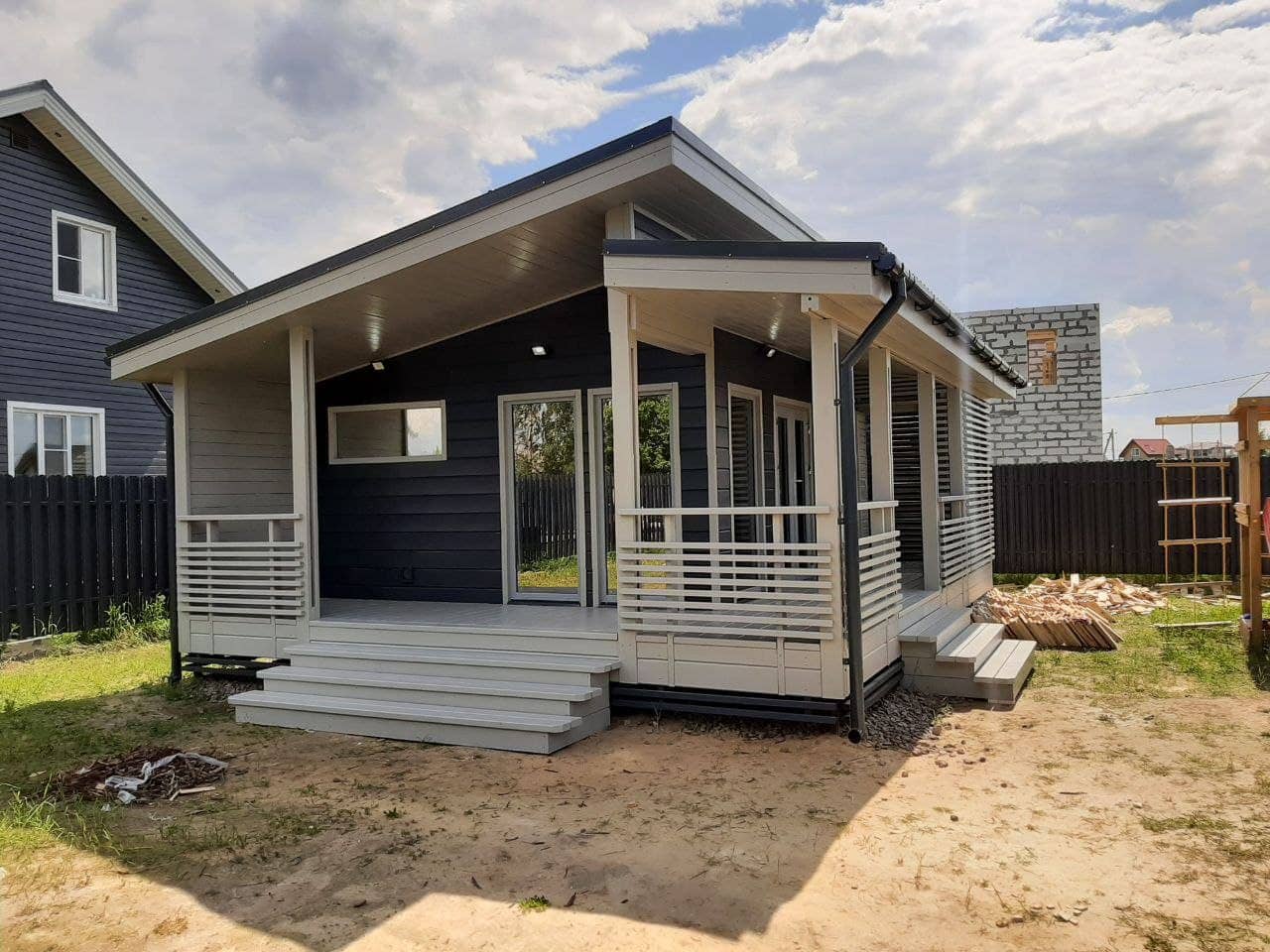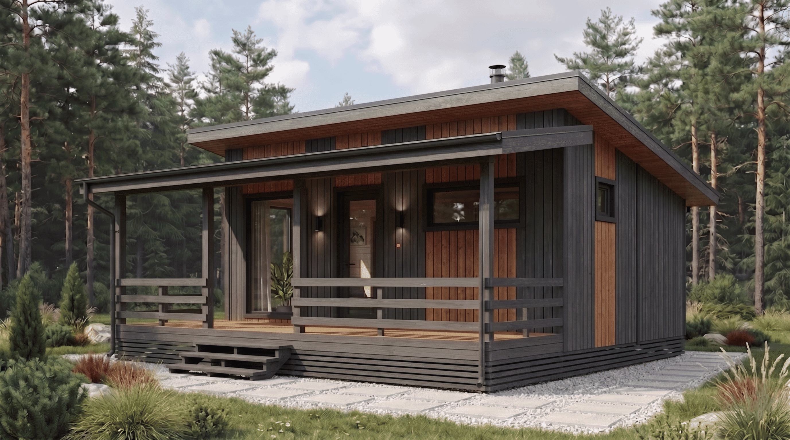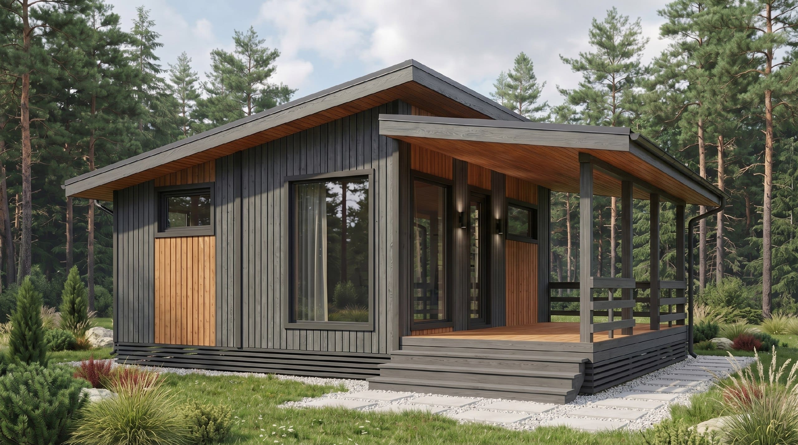 Сдержанная архитектура с двускатной крышей и контрастной отделкой выглядит аккуратно и современно, не теряясь на участке.