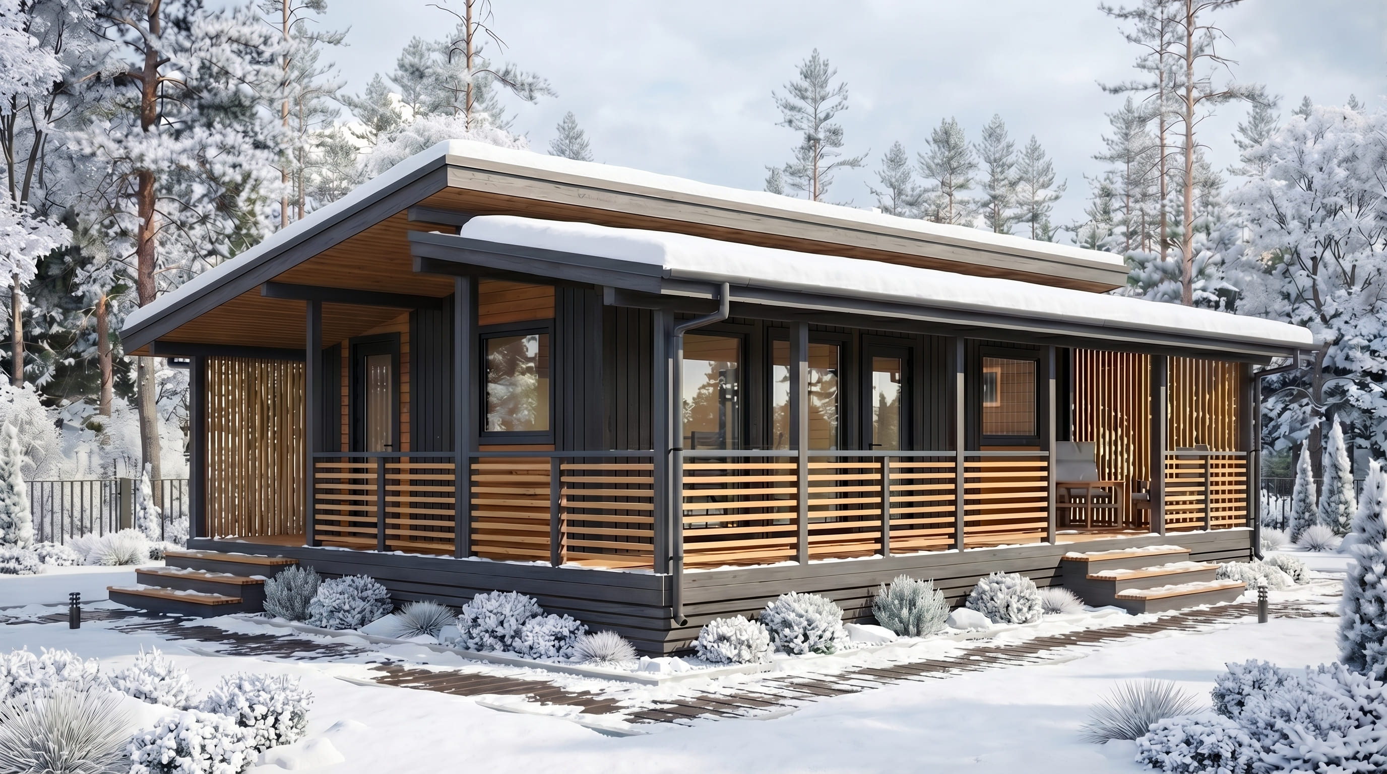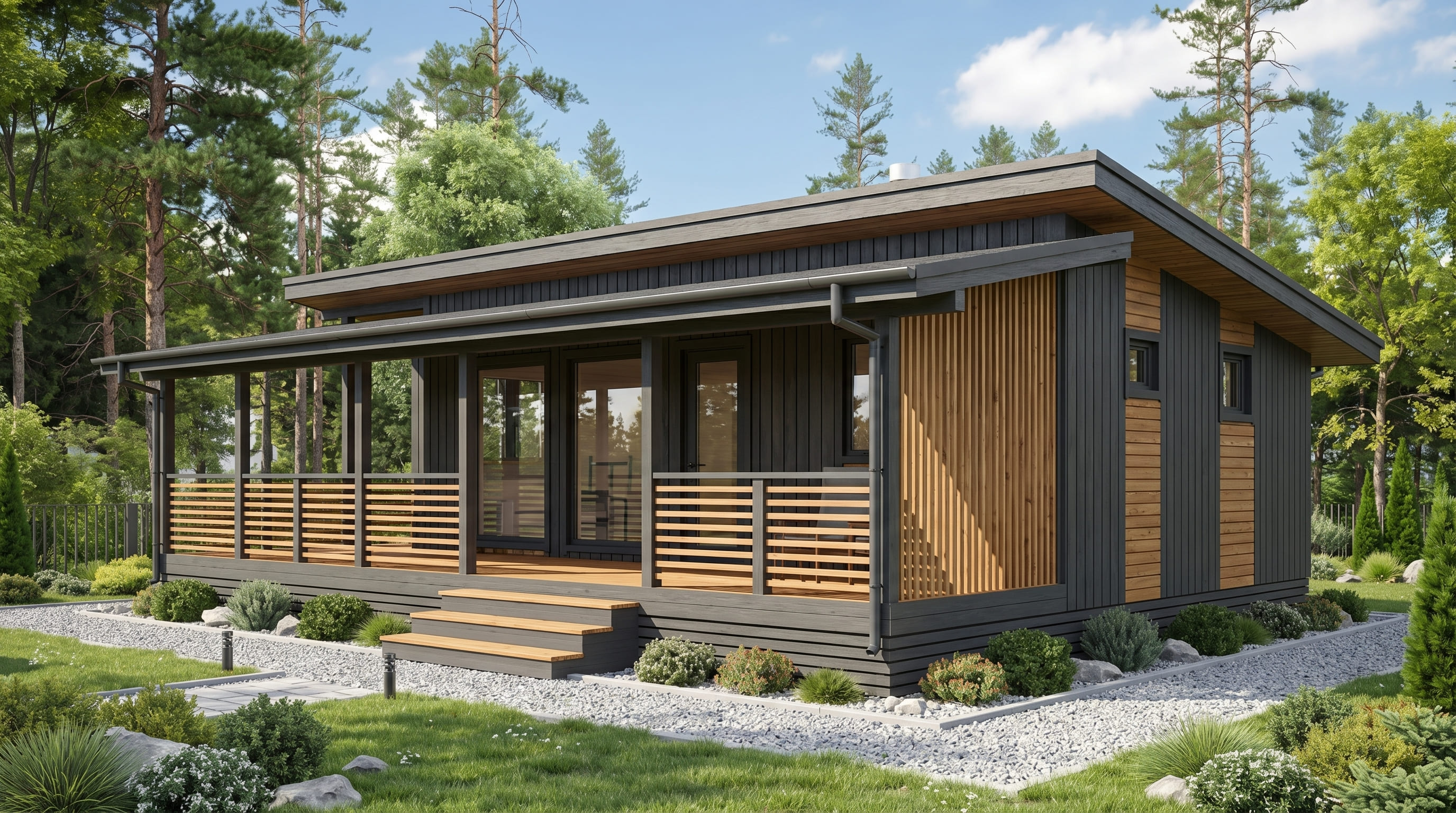 Баня собирается из готовых модулей и устанавливается на участке в короткие сроки без традиционного строительства.