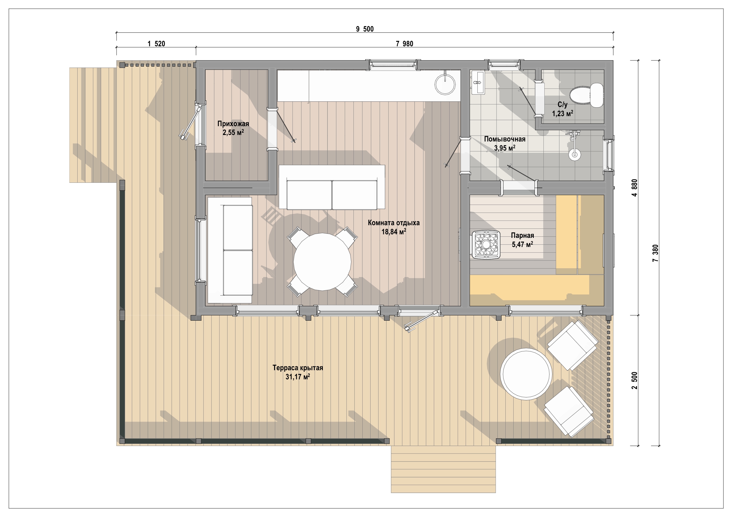 Aurora-Premium XL — баня с удобной планировкой для спокойного и длительного отдыха. Внутри есть парная, помывочная, санузел, прихожая и просторная зона отдыха. Отличительная особенность — угловая крытая терраса и два входа: основной через прихожую и отдельный выход на боковую террасу, где можно разместить купель.