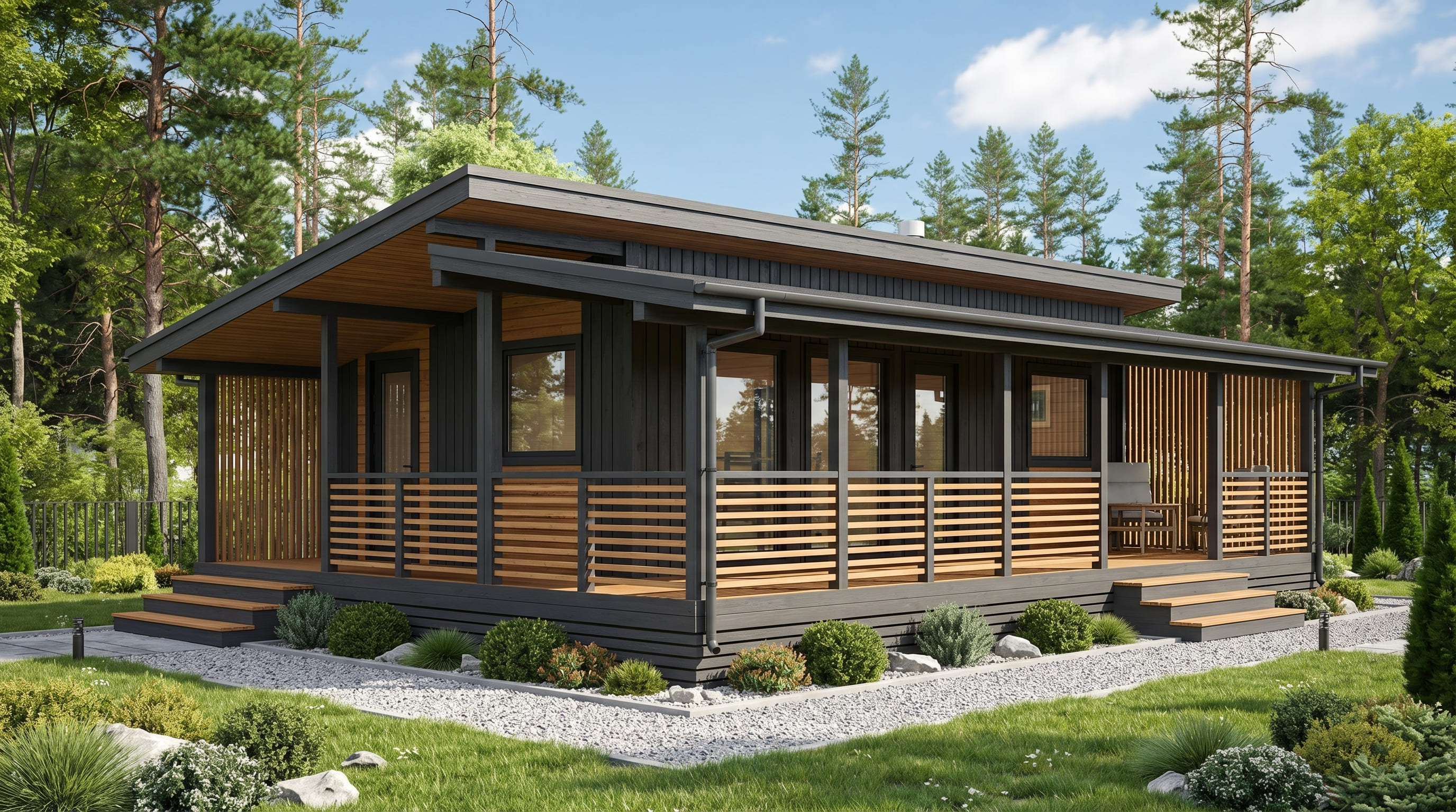 Выразительная архитектура с двускатной крышей и глубокими выносами придает зданию выразительный и дорогой вид.
