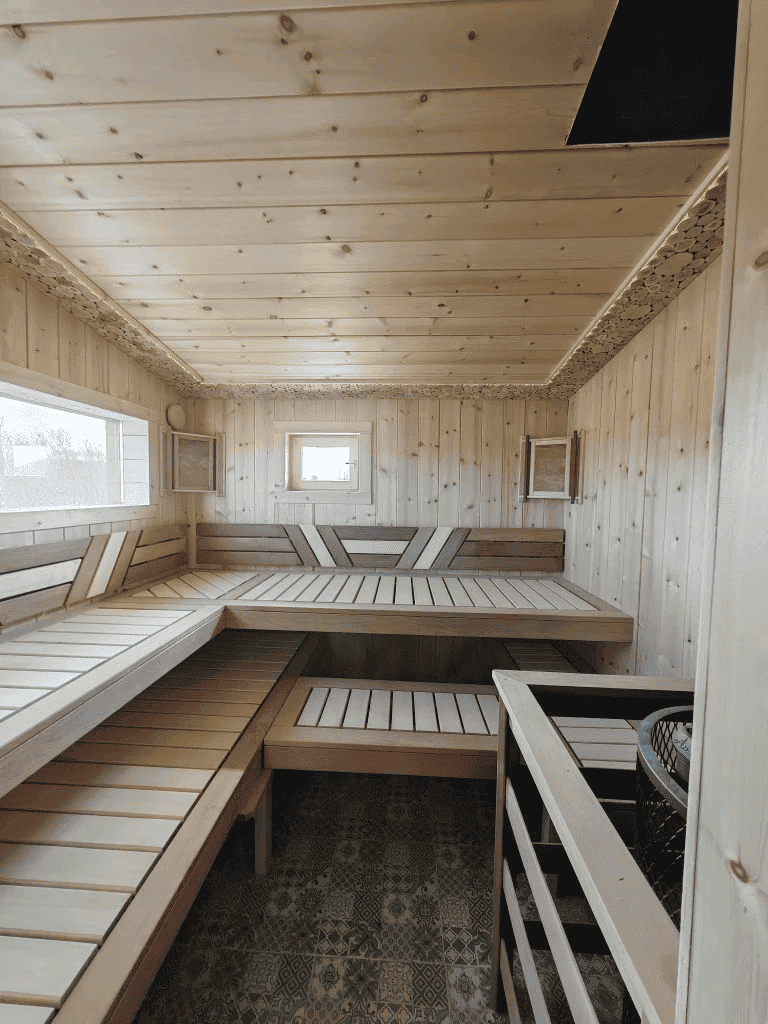 Парная: осиновая вагонка класса "А", безсучковая 16 мм через обрешетку с формированием вентзазора. Пол: шпунтованная доска хвойных пород толщиной 28мм (без слива). Полки двухуровневые 60 и 40 см с прямой укладкой из осины экстра класса, без спинки, без зашивки между полками.