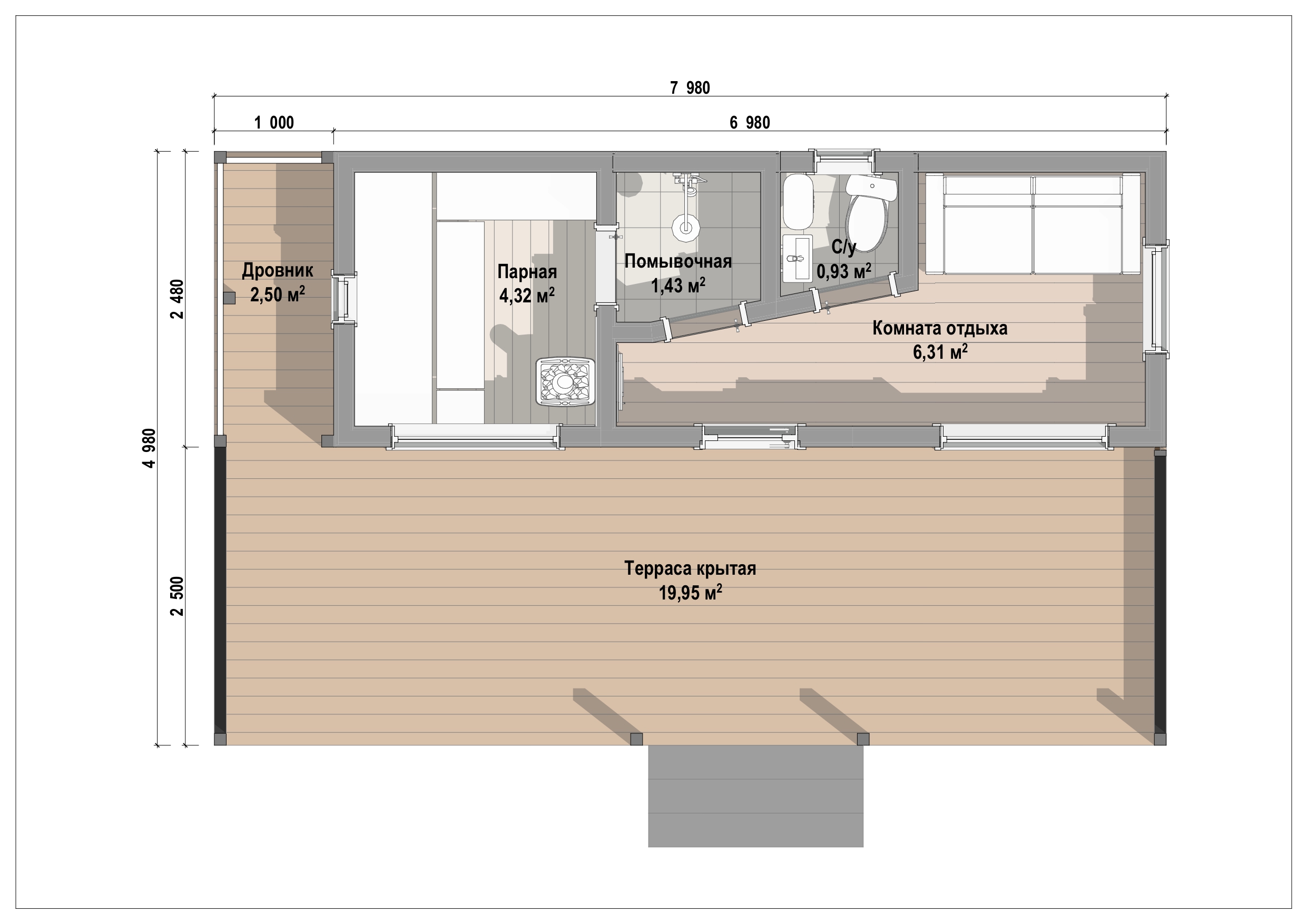 Diplomat-Terra — баня для полноценного загородного отдыха. Внутри — парная, помывочная и комната отдыха, снаружи — просторная крытая терраса и зона под купель (по желанию), идеально подходящая для контрастных процедур и отдыха компанией.