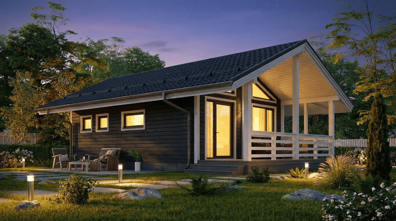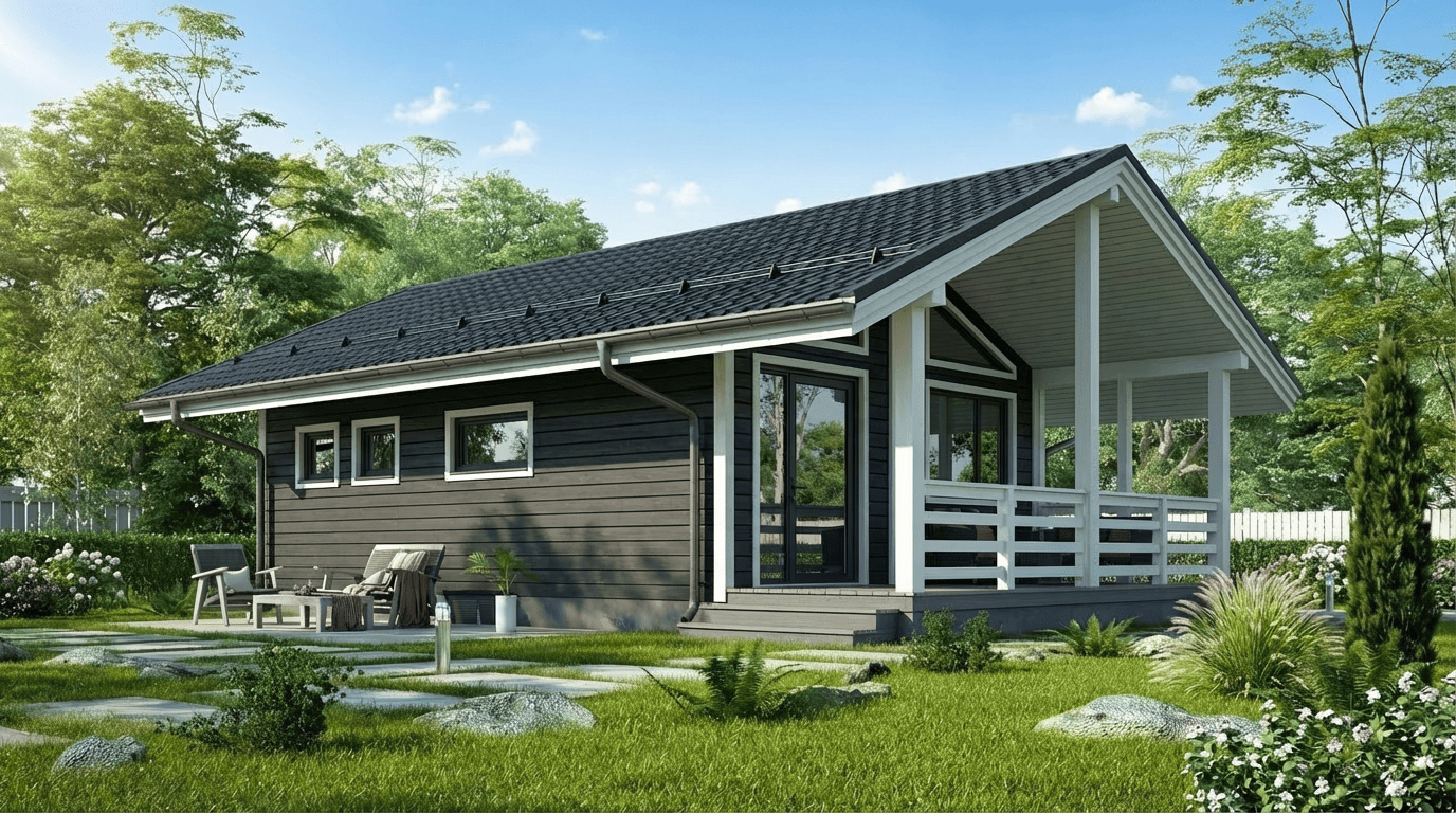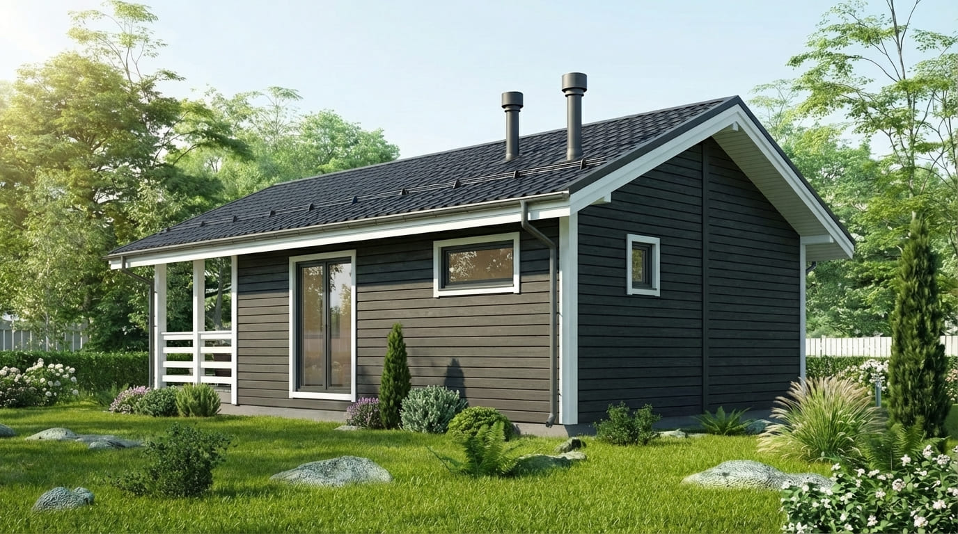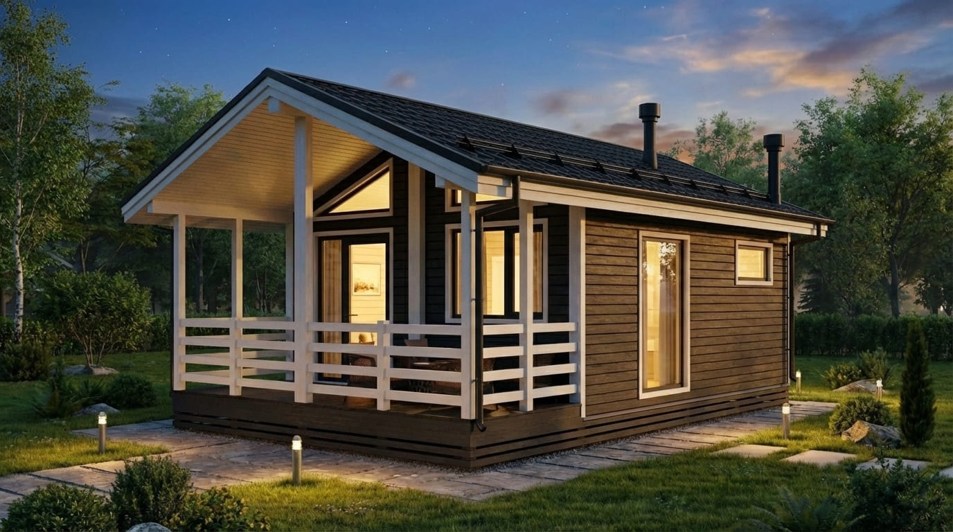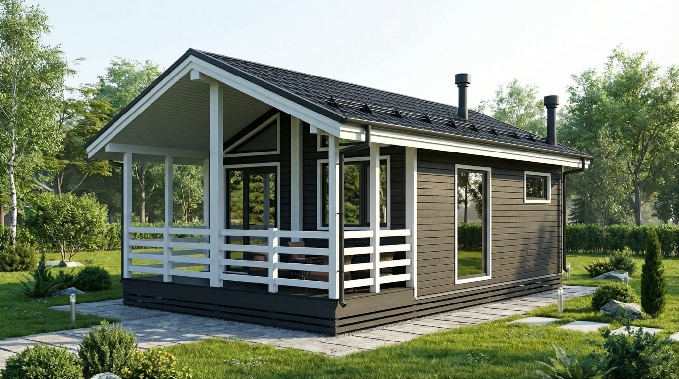 Баня изготавливается на производстве в виде готовых модулей и доставляется на участок с высокой степенью готовности, что позволяет установить её быстро и без долгой стройки.