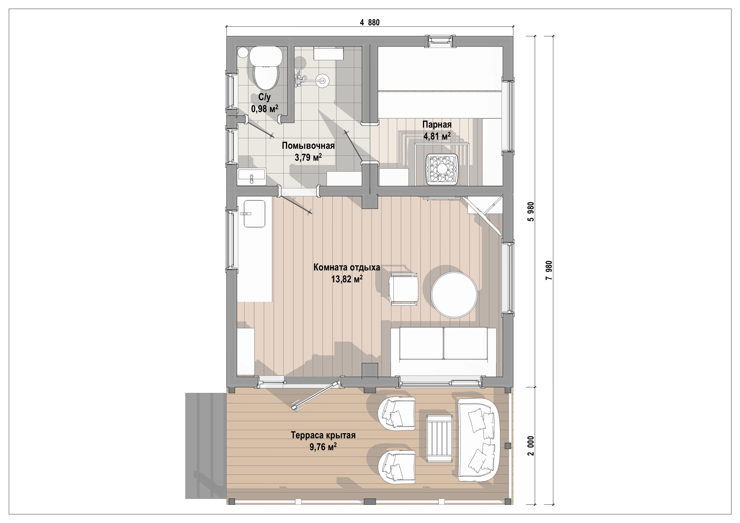 Помывочная: вагонка хвойных пород класса "АВ" через обрешетку с формированием вентзазора. Пол в душевой зоне (до 1 кв.м.): плитка (ЦСП в два слоя с формированием плинтусной зоны, гидроизоляция, сливной трап 100х100 мм, плитка цвет коричневый). Пол в остальной зоне: шпунтованная доска хвойных пород толщиной 28мм (без слива).