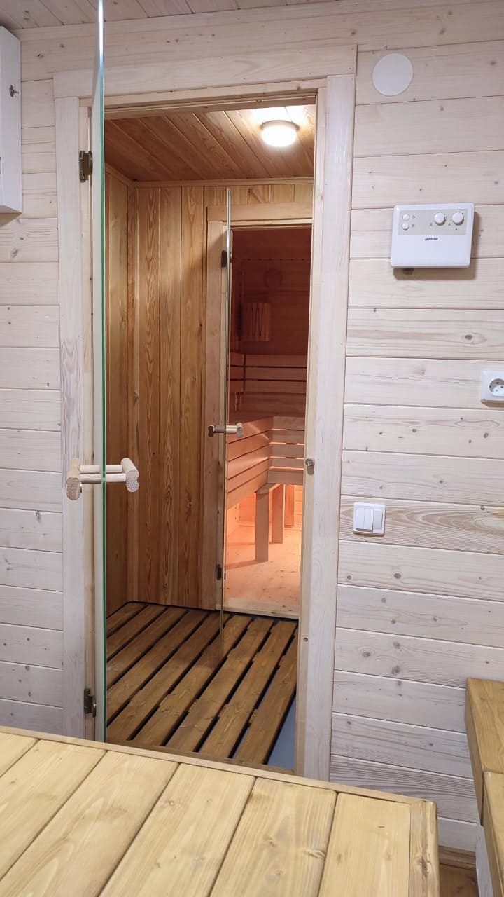 Баня для коммерческого использования на базе отдыха в Карелии. В бане два выхода. Один через прихожую, второй на террасу из комнаты отдыха. В будущем впритык к террасе планируется установка купели. В парной два панорамных окна, отделка термоосиной и чугунная печь с экономайзером. Топка выведена на улицу.