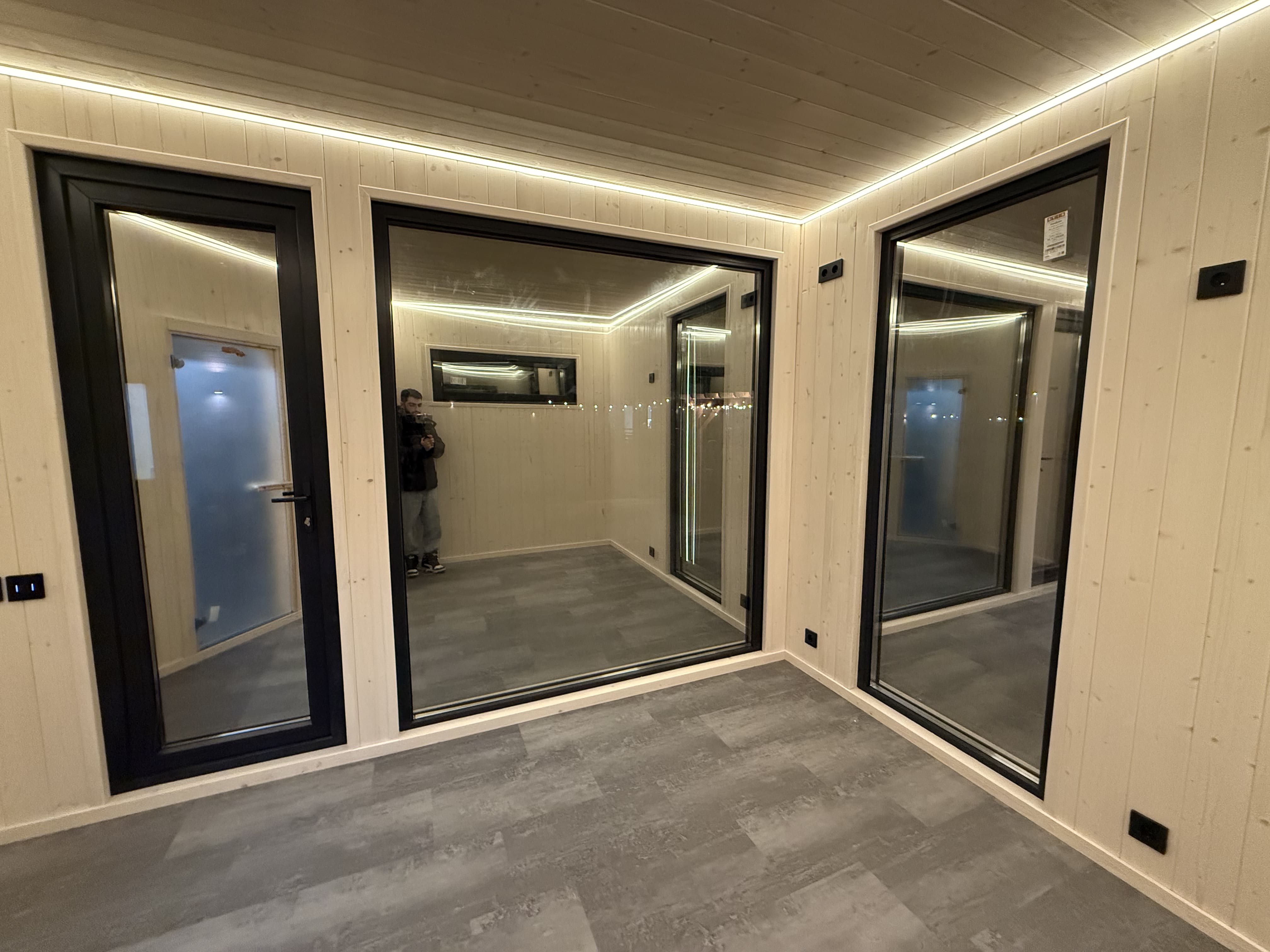 Модульный банный комплекс с интегрированной купелью. Терраса с прозрачной крышей и открытой стропильной системой. Парная из ольхи с парящими полками. Электрическая печь Sangens с удаленным управлением через Wi-Fi. Отделка комнаты отдыха разноширокой влагостойкой фанерой. Контурная подсветка потолка и трековое освещение.