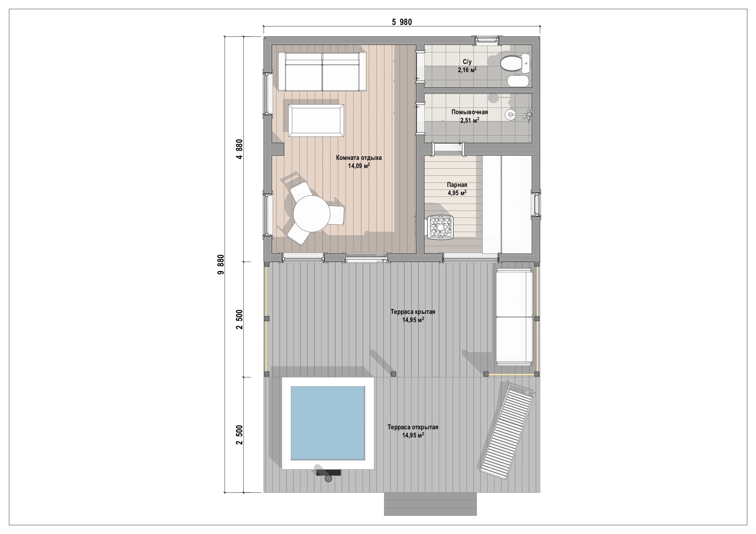 Каркасная баня House-2 по индивидуальному проекту. Полностью собиралась на участке. Баня имеет размеры 6х5,7м , Г-огразную террасу под общей кровлей и открытую террасу 6,0х6,0м. Комната отдыха с панорамными окнами 0,8х1,9м. Парная обшита кедром, в углах светильники с соляными вставками. Душевое отделение в кафеле. Во всей бане сделаны теплые полы.