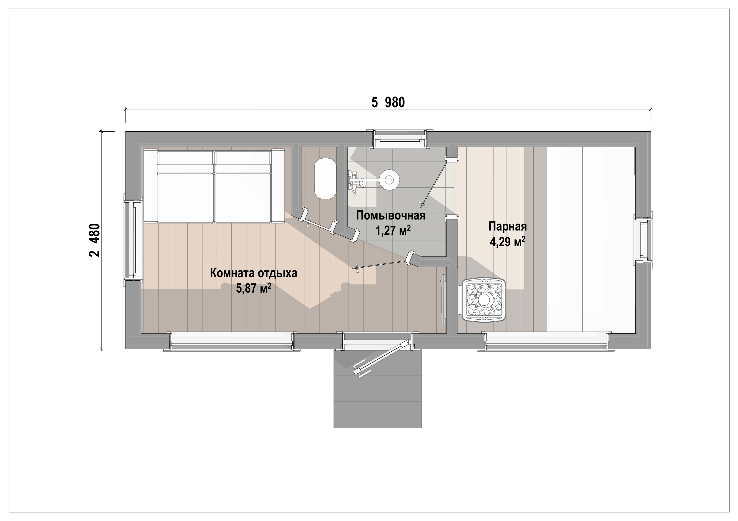 Готовая баня Diplomat-2 6х2,5м. В парной и комнате отдыха панорамные окна 140х50см, для проветривания в комнате предусмотрено распшное окно 1,0х1,0м. Помывочное отделение с душевой системой Тропический душ. В парной сделан нижний выдвижной полок, который можно задвинуть, чтобы подойти к верхнему полку. В комнате отдыха расположен шкаф, где спрятан бойлер и сантехническая разводка.