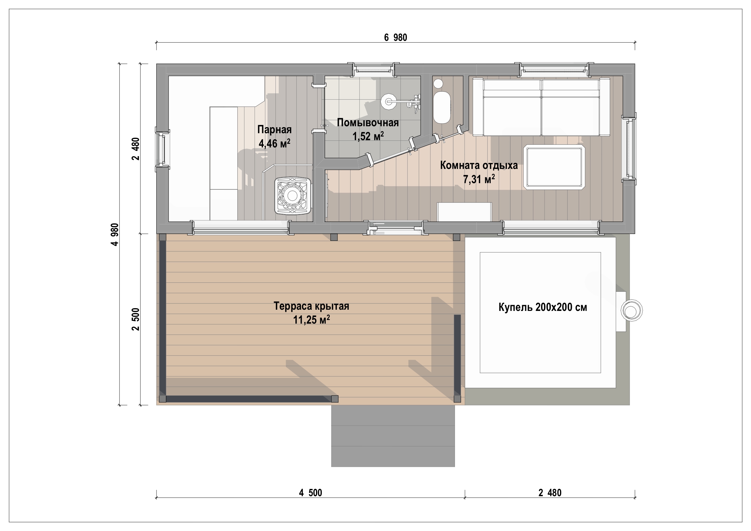 Баня для коммерческого использования на базе отдыха в Карелии. В бане два выхода. Один через прихожую, второй на террасу из комнаты отдыха. В будущем впритык к террасе планируется установка купели. В парной два панорамных окна, отделка термоосиной и чугунная печь с экономайзером. Топка выведена на улицу.